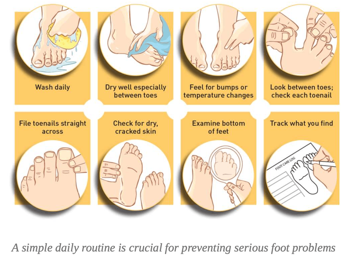 Integrating a simple foot care routine into your daily life can make all the difference. The CDC recommends the following steps:
